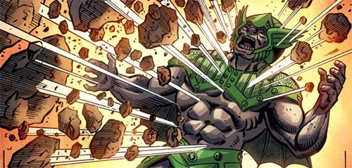 ![]() Created by: Lawrenz Lano First Comic book appearance: The Return of Gaia Force #1 Other appearances: Gaia Force #2, #3, #4, #5, #6, #7, #8, #10, #11, #12, #14 Other Picture: ![]() ![]() © 2013 Gaia Force by Lawrenz Lano | Real Name: Shanvi-Reev Hair: None Eyes: Brown Height: 15 feet Age: Over 600 Born on: Neosa Race/Species: Neosian Base of operations: Neosa/Tapek City, Andaleb IV Classification: Guardian Ethical alliance: Good History Shanvi had been raised to cherish life and give back to the world by doing hard work. He had done just that by working the fields from an early age. He liked the hard work almost as much as he liked being alone. He usually ploughed his parents' fields himself without help from tractor or cattle and at the end of each day, he rejoiced at the work he had done. He had given his sweat to the world, and it would feed him in return. As far as he was concerned, it was an equitable deal. Shanvi was a still a child when he was recruited to fight in the BahNu arenas. The BahNu were impressed by the young Neosian's strength and imposing stature, and they knew he would make a good addition to their fighters. Unfortunately, Shanvi was a very timid Neosian and hated fighting. That did not last long, however. The BahNu had tried to enlist Neosians in their arenas, but for the most part, these refused to fight other Neosians. The BahNu had then decided to bring fighters from other parts of their dominion. These had no qualms about fighting Neosians and the BahNu did not care if the Neosian decided to fight or not. As long as one of the combatants died, the fans were happy. Shanvi soon learned that he would need to fight to survive. And survive he did. The BahNu often made him fight barehanded, as the fans were enthralled by his strength. Shanvi could tear the arms off most fighters sent against him. Sometimes, the only weapons allowed were large boulders. Rare were the fighters who could lift them, but Shanvi did so with ease and used them to literally crush the competition. Shanvi was in the arena when the Guardian destroyed the BahNu's ships and weapons. Seeing the opportunity to flee, he and other fighters turned their rage against their captors. Shanvi used the boulders strewn on the floor of the arena and used them as projectiles to crush any BahNu in sight. Shanvi then felt the gaze of the Guardian upon him. "Your world has suffered long enough," the Guardian echoed in his mind. "It is time for you to join Rubikhon in her fight to save it. Join her, Geomass, and continue to crush those who would do it harm." That day, Shanvi-Reev was no more. He had been left behind in the arena. Geomass had left the victor and was now one of the Children of the Guardian. Some 250 years later, a being showed up in the Neosian system, and Geomass was the first to respond to this intrusion. He battled the being, whom he thought was a new BahNu weapon, but he later learned that this being was also a child of the Guardian. His name was Silverlance. Geomass and Silverlance became good friends, and their friendship grew even more after Silverlance settled permanently on Neosa. For 80 years, they fought alongside until the arrival of the rogue guardian, Q'Aestor. Geomass was sent to warn Silverlance's former team, Gaia Force, of the impending threat that Q'Aestor represented. Alongside Silverlance's former allies, Geomass fought and helped defeat the rogue guardian. Geomass eventually joined the New Gaia Force. Powers Geokinesis: Geomass can tap an unlimited amount of matter and expel it in the form of meteorites. He can shape this matter into masses approaching the size of dwarf planets. Using this power, he fashioned all of Neosa's artificial moons, and on one occasion, Geomass has moulded his rocky discharge into a protective suit. Geomass can also control rocks and soil in general, but he can only reabsorb matter he has created. ![]() Space travel: Geomass can survive and travel the rigorous expanses of interplanetary space. Super strength: Geomass is the strongest of the Neosians, although his teammate Collapsar would beg to differ. The truth, however, is that Geomass is the stronger of the two, but Collapsar can match him using his gravity powers. Self-sustaining: His body is nourished by starlight thus eliminating his need to eat. He can, however, enjoy the experience, and often enjoys a good ale at the Rogues' Café. Physical/energy resistance: He can resist attacks of the highest magnitude. Omnilinguilism: Geomass can communicate with any intelligent species through guardian speech, an ability that emits vocal messages on multiple frequencies, including the psionic. Enhanced vision: He can see in various modes and can stare directly at the sun. Extended lifespan: Geomass has already lived over 600 years, and he still shows no signs of aging. Weaknesses: Although no one but Q'Aestor managed to extract the Guardian energies out of other guardians, it stands to reason that Geomass would be susceptible to the same technique. |