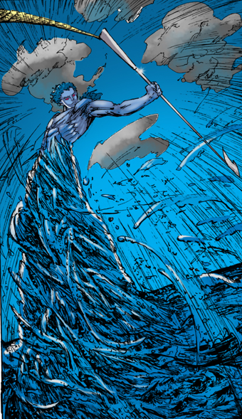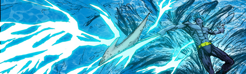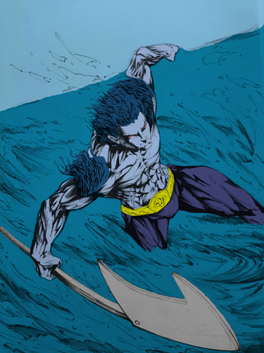 ![]() Created by: Lawrenz Lano First comic book appearance: Other Pictures: ![]() Art by Gilbert Monsanto ![]() Art by Wing Kun ![]() © 2013 Gaia Force by Lawrenz Lano | Real Name: Frantz Blau Hair: Blue Eyes: Red Height: 6 foot 1 inch Age: 29 Born in: Aachen, Germany Base of operations: Mobile/World oceans Classification: Randomite Ethical alliance: Good History Frantz was part of the Wildpeace initiative started by Pro-Gaia environmentalists. Wildpeace had been informed that Russians were bringing a new oil platform in the Arctic, and Frantz's team had gone to investigate. However, as they approached the platform, their communication system went down before they could give their location to their headquarters. Unknown to them, the Russians had known that they had been en route and had jammed their transmissions. They were not about to let environmentalists interfere with their plans again, and they had taken measures to prevent that. The Wildpeace ship was quickly intercepted by a Russian submarine. Frantz's team did not let themselves get intimidated. They had tangled with these types of people many times before, and although things did sometimes heat up, the sight of cameras usually let cool heads prevail, but this was not one such time. The submarine had not come as a show of force, but as a means to a definitive end to this intervention. It fired a torpedo and the Wildpeace vessel was hit and suffered massive damage. Faced with imminent death, Frantz and his team declared their surrender, but the submarine fired a second torpedo. The ship sank, crew and cameras with it. With no proof that Wildpeace had ever been there, the Russians returned to their work. Frantz was thrown off as the ship exploded around him. He hit the water and tried to stay afloat, but sank immediately. A chain had wrapped itself around his legs, and it was dragging him into the frigid depths. He tried to fight and pry it off, but hypothermia hit him. He was pulled into the abyss, where pain and fear took him as his lungs filled with water. They say your life flashes before your eyes as you die, but his did not. Why? He wondered. Wasn't my life worth reliving? It was a good life. I did much good, to the people, to the planet. I have lived as I have died. Fighting for what I believed in. Surely it is a life worthy of being viewed again... What am I saying? I am dead. There is nothing to view. Just accept your fate, Frantz. The life you knew is gone. He felt something beneath his feet. Frantz opened his eyes. He was on the sea floor. Water was around him and above him. Miles of water. But there was no pain. There was no terror. He could breathe. He could move. The chain was still around him, so he grabbed it and pulled. Effortlessly, the chain links broke away, setting him free. That was when he saw his hands. They were not his. They were blue, webbed, and covered with scales, as was his body. He ripped at his clothes and touched his ribs. Jets of water were flowing through him. Where he once had ribs, he now had gills. He was changed, and no longer Human. He had become a Randomite. He started to swim. Up, up he went. The darkness soon dissipated and debris from the ship was now visible. Bodies slowly drifted among them. These had not been saved as he had. He felt the anger rise in him, and he sought out the submarine that had caused the destruction. He found it easily. Its engines echoed under the watery expanse. He reached it in seconds and pulled off its rudder. He bashed his fists on its hull and tore at its metal skin, giving the ocean a new place to conquer. Then he heard the screams. People were about to die. Justice would be rendered. It was what they deserved, after all. Frantz could hear the metal structure creaking and snapping. It would be over soon and his teammates would be avenged. But as he saw his hands once more, he asked himself; "Is this what I have become, a monster? Have these changes taken away my Humanity as well? No, I can feel their fear. I can feel their pain. I am still Human, no matter what appearances now show. I will not be the monster, I will be what I always was; the one who cares and protects." Frantz grabbed the submarine and carried it to the surface. There would be no more deaths this day. Men watched from the oil platform as a waterspout rose from the sea, a blue creature was riding it. It landed on the platform and ordered the men to leave these waters. But they retaliated with guns. Frantz had his answer, these would not be reasoned with, so he dove beneath the platform and started tearing it apart piece by piece. No one died from his attack, but the platform and submarine lay dead in the water. The men would have no choice but to radio for help. In the meantime, Frantz would be waiting and watching. The seas would now be his home and he would continue to protect them. Within a few weeks, the world soon learned that a Randomite going by the name of Koraal was protecting the oceans. Powers Speed: Koraal can swim at speeds of around 500 mph but by jetstreaming above the waves, he can reach Mach 1. Elemental blast: He can release electrical discharges capable of killing or stunning. ![]() Sonic generation: By clicking his tongue, he can release a highly concentrated sonic pulse capable of punching through a brick wall. Hydrokinesis: Koraal swims by pumping water through his gills. This causes a push, which he calls jetstreaming. He can also jetstream above the waves by drawing water through his gills and pumping it out. Through this technique the water is continuously pumped around his body causing a waterspout which he can ride. The waterspout he creates can keep him afloat or can be directed as a blast. Enhanced vitals: His body can acclimate to the intense pressure found in the deep oceans by evacuating all the air from his system. He can also function in the coldest of waters. Heightened senses: His eyes can see in the dark depths and can detect the bioelectrical impulses 