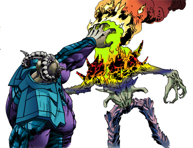 ![]() Created by: Lawrenz Lano First appearance: Gaia Force #10 ![]() Other appearances: Gaia Force #12 Other Pictures: ![]() Art by Suluh Radityo © 2013 Gaia Force by Lawrenz Lano | Real Name: Kalabor Veron Hair: None Eyes: Red Height: 6 foot 2 inches Age: Undisclosed Born on: Obsidia Race/Species: Obsidian Occupation: Bounty Hunter Base of operations: E'lah Dominion Classification: Enhanced Being Ethical alliance: Evil History The world known as Obsidia is a world almost totally covered in magma. The humanoid species that lives there has developed a very strong outer shell, enabling them to survive the intense heat of their world. Obsidians are naturally very strong, but one individual was selected to be even stronger. Kalabor was approached by the mysterious Ravager and given the opportunity to make his mark beyond the confines of his world. Due to the instability of their world's landscape, Obsidians never managed to develop a highly advanced technological society, much less the means to leave their world. Intrigued by the prospect of seeing what was out there, Kalabor accepted Ravager's offer and became one of Ravager's Hounds. After he was imbued with guardian energy, Kalabor's power kicked in. He could now destroy almost anything with his fists and what his fists could not destroy, his blood and sweat would as they had similar properties to magma. Since none from his world would ever make it to the stars, he would make sure that their name would be heard. Taking on the name of his people as his own, he would make his mark out in the universe. Obsidian became well known in certain circles and was eventually approached by the Gamblers' Guild. They offered him the opportunity to fight in their tournament and had high hopes that he could defeat their current undefeated champion, Farpoint. The Guild wanted Farpoint defeated because his current winning streak made betting one-sided and predictable. If Obsidian could defeat him, certain parties could make a great deal of money on the fight. Obsidian agreed to the fight, but found that he could not defeat Farpoint. In a desperate attempt, he used his magma touch and was disqualified for doing so. Farpoint kept his title. After this humiliating defeat, Obsidian swore that he would one day get his revenge. He eventually got his rematch with Farpoint and defeated him in fair combat. Powers Super strength: Obsidian possesses enhanced strength, enabling him to lift almost 300 tons. His hitting power is quite formidable and is capable of smashing through two-inch steel. Obsidian can also ram his head through walls with ease. ![]() Physical/energy resistance: His tough outer shell protects him from a variety of attacks. The guardian energy also helps him survive in alien environments. Substance secretion: Obsidian can secrete his bodily fluids through his pores, thus burning his opponents to a crisp. ![]() Physical appearance: Obsidians have ramming horns on their head. |